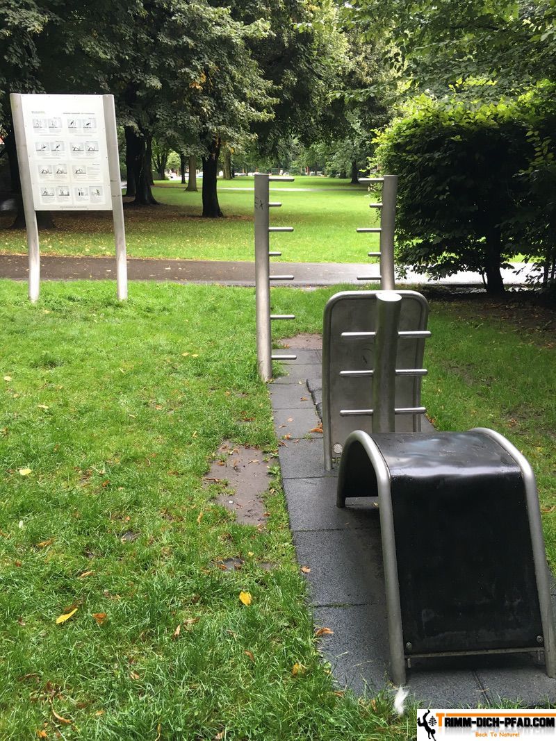 Lediglich das Moos unter den Sitz- und Liegeflächen deutet darauf hin, dass die Geräte dort schon seit einiger Zeit stehen. Es stört aber in keinem Fall die Ästhetik - dafür sorgt leider das Graffiti, Schmierereien an den Geräten, aber auch an der Tafel ( Übungsbeschreibung ) stören das sonst sehr harmonische Bild. Außerdem bietet dieser Trimm-dich-Pfad leider nur eine Gerätegruppe und nicht wie bei vielen anderen Parkanlagen mit Trimm-dich-Pfaden viele abwechslungsreiche Geräte. Mehr ist dieser Anlage aber auch nicht anzukreiden, Geräte und Umgebung in einem allgemein sehr sauberen Zustand.